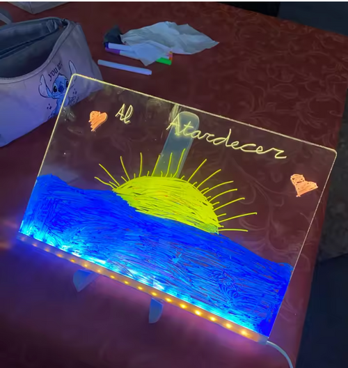 El set incluye una pizarra mágica con luz LED, 7 marcadores fluorescentes y paños de limpieza reutilizables, todo lo necesario para que los peques den rienda suelta a su creatividad.